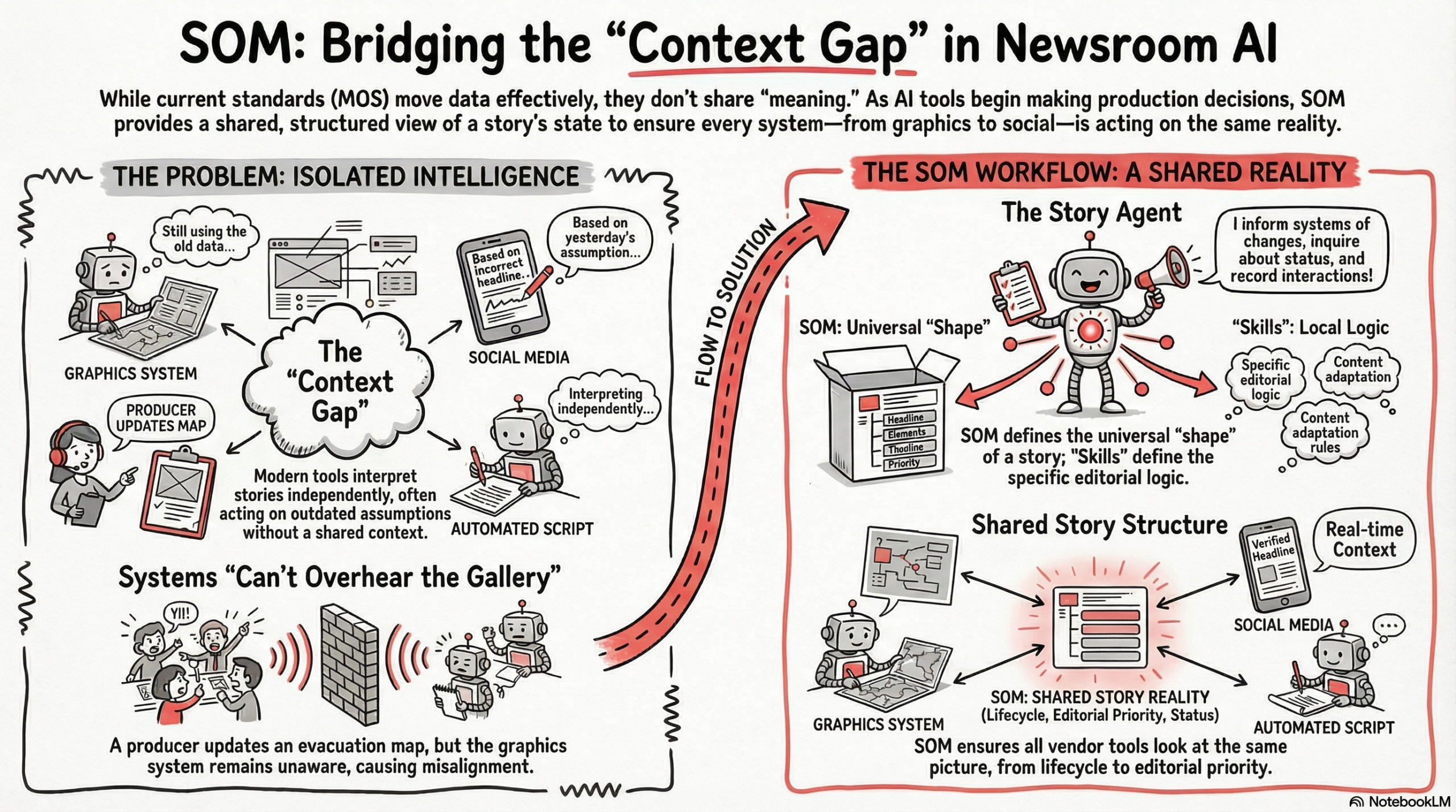 The working concept includes a Story Agent: one per story, persistent from tip-off through distribution. It helps connected systems stay aligned as context changes, inquires across the stack about what’s happening, and records every interaction to an auditable trail. Not a replacement for existing systems or standards — a coordination layer that can sit across them, including in MOS-based environments.